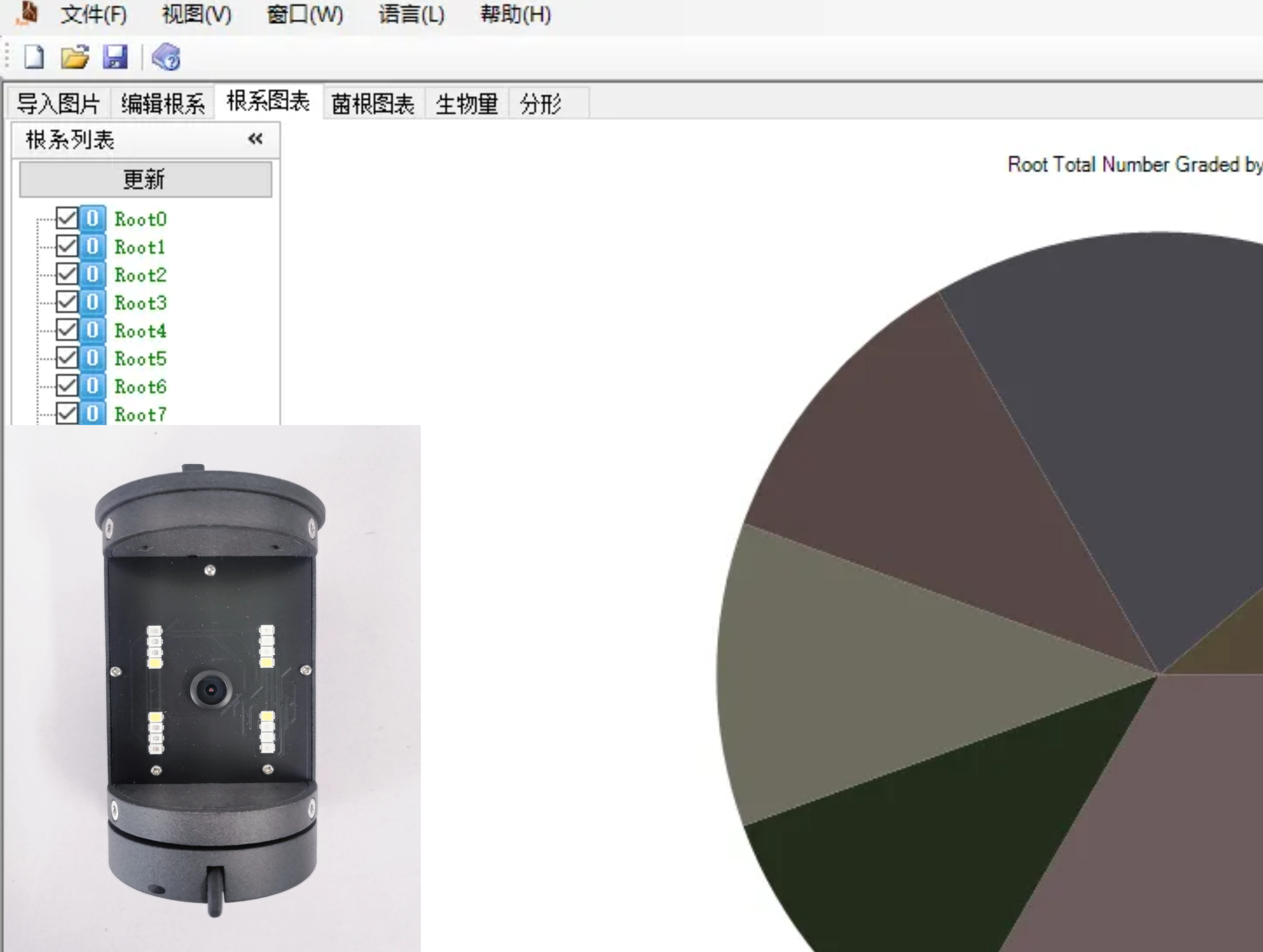 18.根系參數(shù)測定包含根拓?fù)鋮?shù)測定、根系長度、起始直徑、結(jié)束直徑、平均直徑、體積、表面積、分支結(jié)構(gòu)、根系生長速率、根系壽命等參數(shù);功能上具有RHS 和UCL彩色模式、豐富快捷鍵、多語言模式、信息編輯、輔助標(biāo)定等功能;